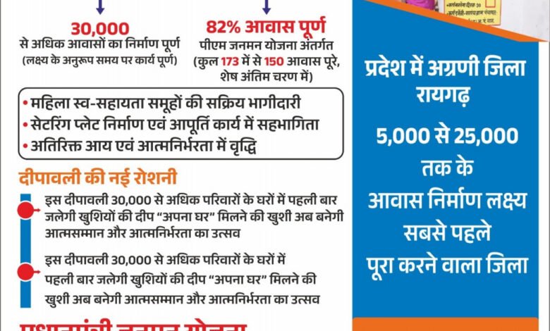 रायगढ़ जिले में वित्तीय वर्ष 2024-25 में स्वीकृत आवासों में से इन 30 हजार से अधिक घरों का निर्माण समय पर पूरा होना न केवल प्रशासनिक दक्षता का उदाहरण है, बल्कि यह ग्रामीण हितग्राहियों के जीवन में स्थायित्व और सम्मान का नया अध्याय भी जोड़ रहा है। इस बार दीपावली उनके लिए वास्तव में विशेष होगी, क्योंकि इस बार दीये उन घरों में जलेंगे, जिनकी दीवारें खुद उनकी मेहनत, उम्मीदों और सरकारी योजनाओं की संवेदनशीलता की कहानी कह रही हैं।