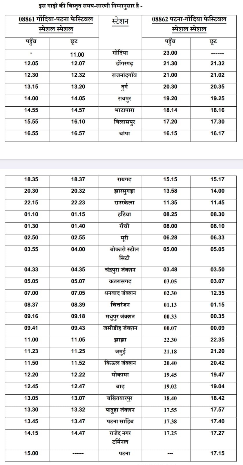 इसी कड़ी में रेलवे द्वारा होली के अवसर पर मार्ग गोंदिया-दरभंगा मार्ग की गाड़ियों में होने वाली भीड़ को ध्यान में रखते हुए एक होली फेस्टिवल स्पेशल ट्रेन का परिचालन गोंदिया एवं पटना के मध्य एक फेरे के लिये की जा रही है । यह गाड़ी गोंदिया से गाड़ी संख्या 08861 नंम्बर के साथ दिनांक 02 मार्च, 2026 को तथा पटना से गाड़ी संख्या 08862 नम्बर के साथ दिनांक 03 मार्च, 2026 को चलेगी ।