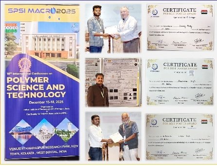 सुदीप्त पॉल को ‘स्मार्ट खिड़की और सुरक्षा अनुप्रयोगों हेतु पराबैंगनी किरण-अवरोधक ताप-संवेदी बहुक्रियात्मक पॉलिमरिक संरचना’ पर किए गए शोध के लिए सर्वश्रेष्ठ पोस्टर पुरस्कार प्राप्त हुआ, जो स्मार्ट और ऊर्जा-कुशल तकनीकों के लिए प्रभावी पॉलिमर-आधारित समाधान प्रदान करता है।