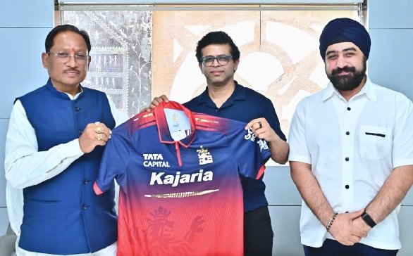 रायपुर. रॉयल चैलेंजर्स बेंगलुरु (RCB) की ओर से मुख्यमंत्री विष्णु देव साय को टीम का आधिकारिक जर्सी भेंट कर रायपुर में प्रस्तावित आईपीएल मैच के आयोजन के लिए औपचारिक रूप से आमंत्रित किया गया। इस अवसर पर आरसीबी के वाइस प्रेसिडेंट राजेश मेनन तथा भारतीय क्रिकेट कंट्रोल बोर्ड (BCCI) के संयुक्त सचिव श्री प्रभतेज सिंह भाटिया उपस्थित थे।