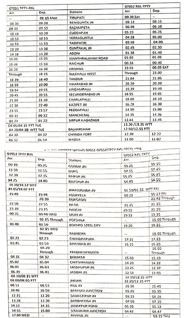 इस गाड़ी का दक्षिण पूर्व मध्य रेलवे में ठहराव की समय सारणी इस प्रकार है :- गाड़ी संख्या 07051 नंम्बर तिरुपति से 08.15 बजे रवाना होकर दूसरे दिन गोंदिया 09.10/09.25 बजे, दुर्ग 11.50/11.55 बजे, रायपुर 12.30/12.35 बजे, बिलासपुर 14.25/14.40 बजे, झारसुगुड़ा 18.05/18.07 बजे, तीसरे दिन रक्सौल 17.00 बजे पहुचेगी । इसी प्रकार विपरीत दिशा में भी गाड़ी संख्या 07052 नम्बर रक्सौल से 03.15 बजे रवाना होकर दूसरे दिन झारसुगुड़ा 01.53/01.55 बजे, बिलासपुर 04.40/04.50 बजे, रायपुर 06.20/06.25 बजे, दुर्ग 07.15/07.20 बजे, गोंदिया 09.20/09.30 बजे, तीसरे दिन तिरुपति 09.30 बजे पहुचेगी ।